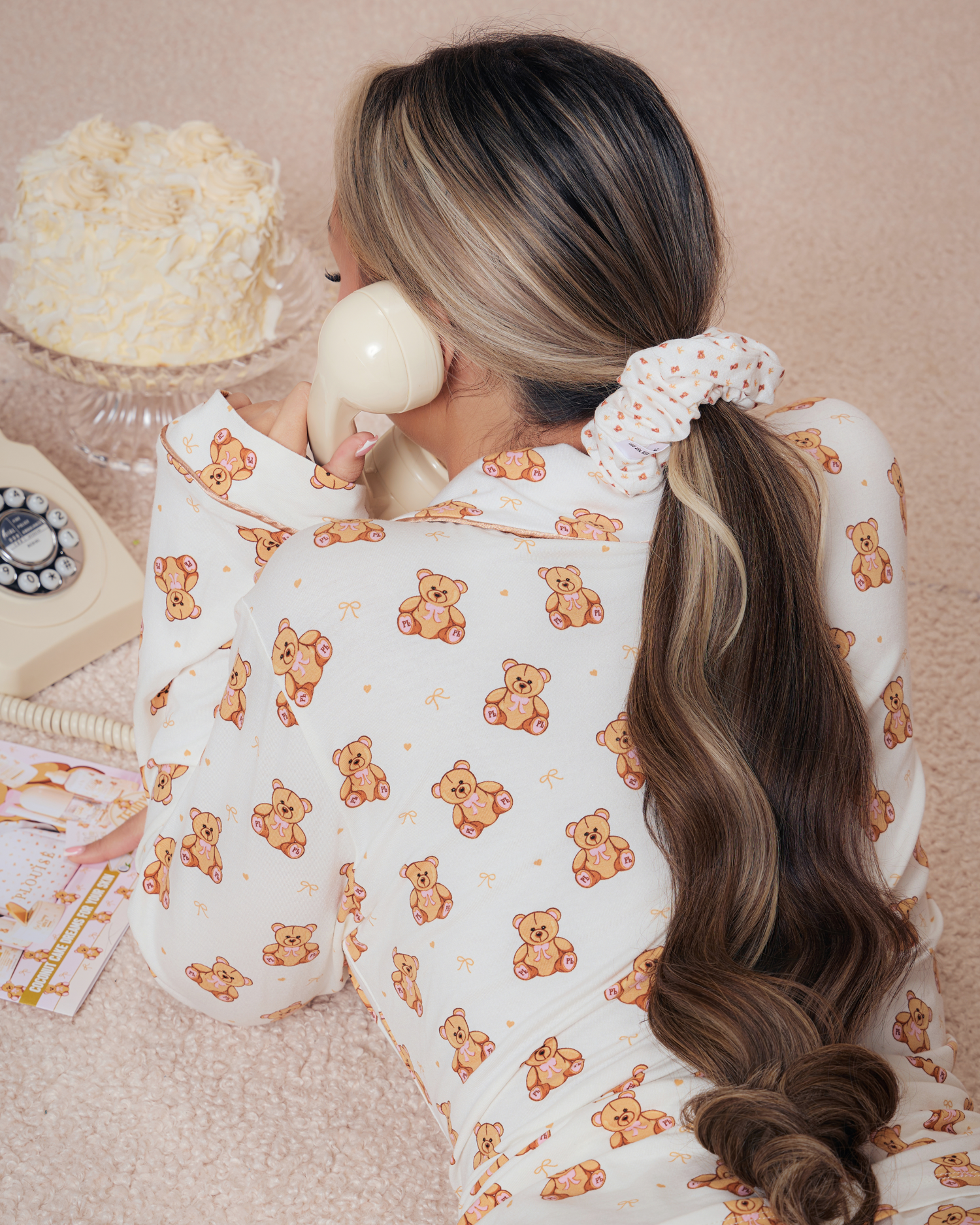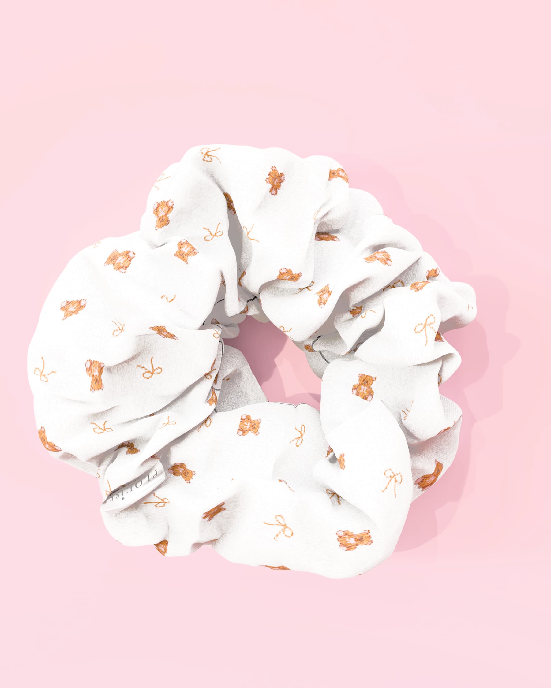Deze schattige scrunchie is ontworpen om perfect bij de Teddy-collectie te passen en heeft een all-over teddybeerprint op een zachte, comfortabele stof die zacht aanvoelt op je haar. Of je nu thuis aan het loungen bent, je klaarmaakt om naar bed te gaan of je haar aan het stylen bent voor een gezellig dagje uit, deze scrunchie houdt alles schattig zonder te trekken of te trekken.